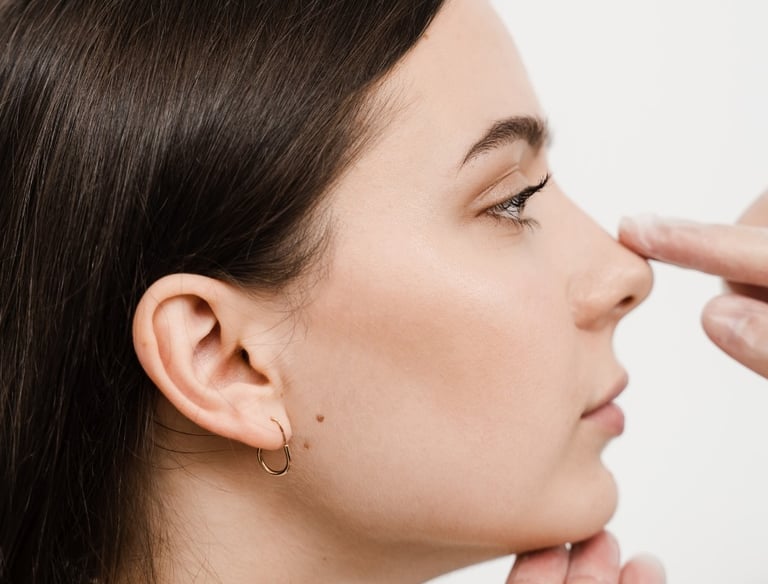 Correção de imperfeições do nariz sem cirurgia, proporcionando um perfil mais alinhado e elegante.